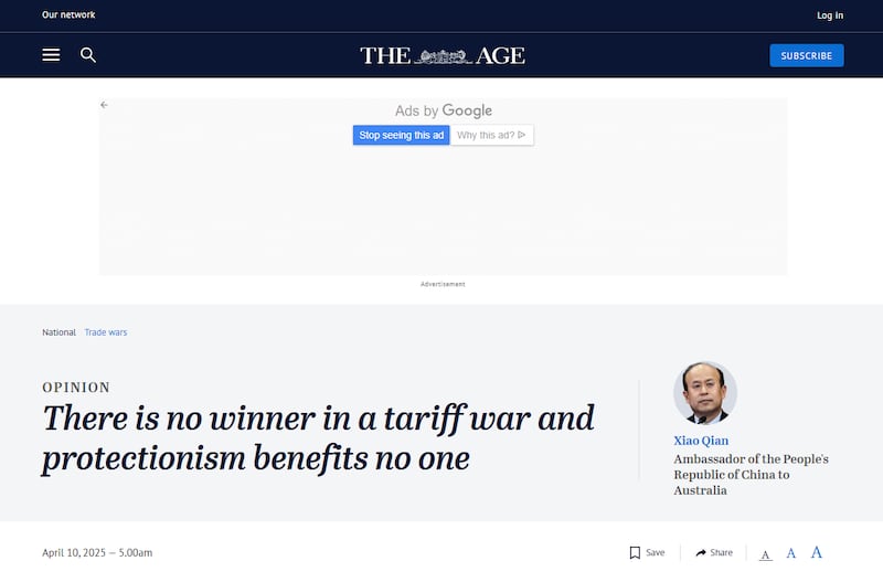 中國駐澳洲大使肖千,周四分別在墨爾本《時代報》 (The Age)和《悉尼晨鋒報》(The Sydney Morning Herald)撰文,呼籲坎培拉與北京攜手合作,共同捍衛全球多邊貿易體系。