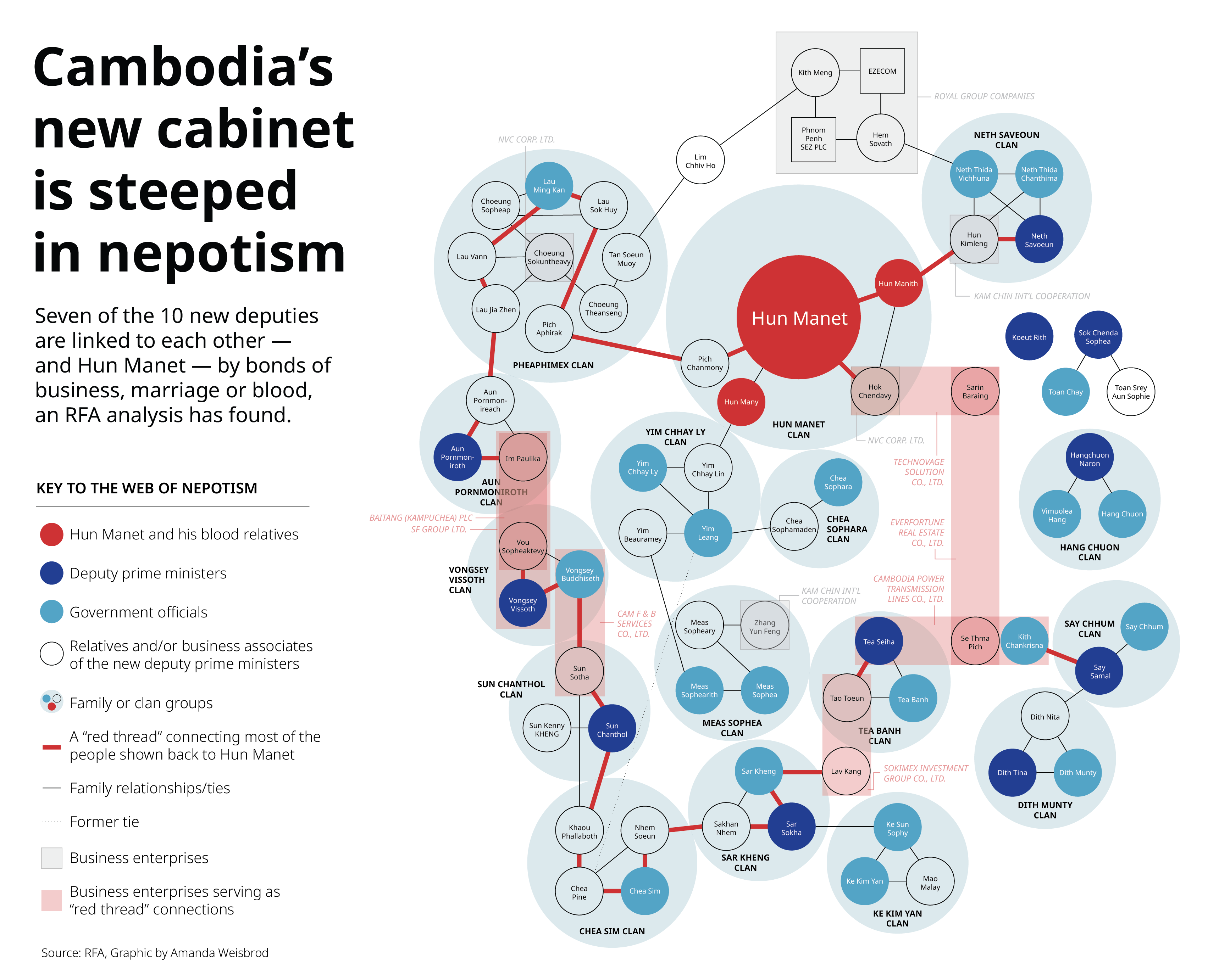 Even when they’re a step removed from the red thread, this group includes some of the most powerful people in Cambodia. Click the buttons below to reveal the members of each clan displayed in the graphic.